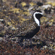 American Golden-Plovers have dark brown upper parts, spangled with gold to pale yellow or whitish. A white stripe extends from the forehead, over the eyes, to the wings. Breeding males are solid black from chin to under-tail coverts. Females are duller in color. Non-breeding adults and juveniles have white throats, gray-brown breasts, and white bellies. The breasts and sides may be striped with brown, or spotted in juveniles. American Golden-Plovers can be distinguished from Black-bellied Plovers by their smaller size, dark rump and wings, and gray under the wing. Distinction from the Pacific Golden-Plover is tricky. Consult a good field guide.