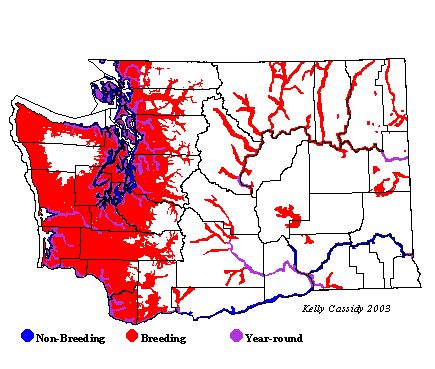 Wood Ducks are common breeders from March through August in lowlands west of the Cascades. In eastern Washington, they are uncommon in the central Columbia Basin, but found more commonly in the lowlands, especially along major river valleys in northeastern Washington. In winter, they are uncommon, but still present in some areas west of the Cascades, and wintering numbers appear to be increasing.
